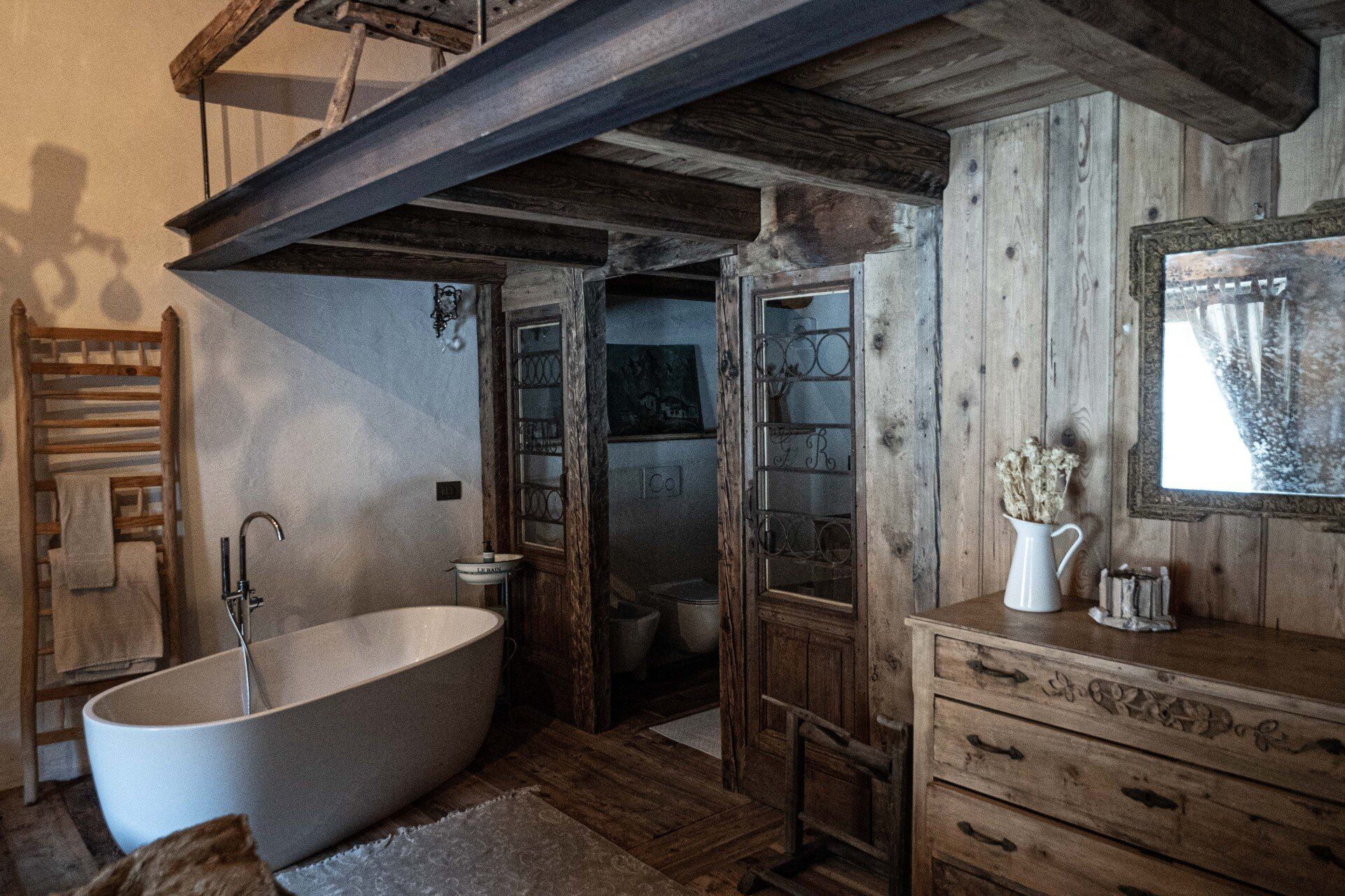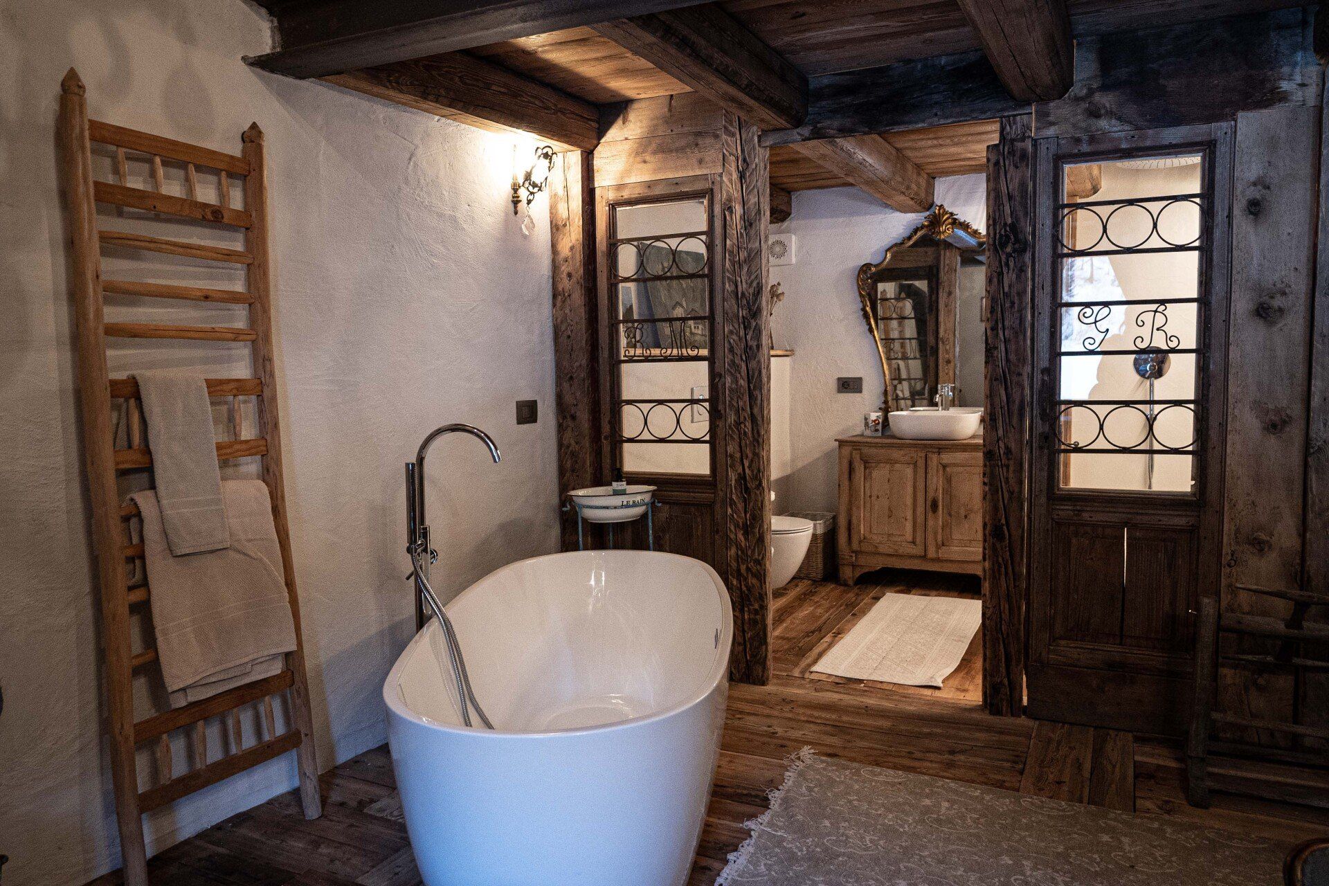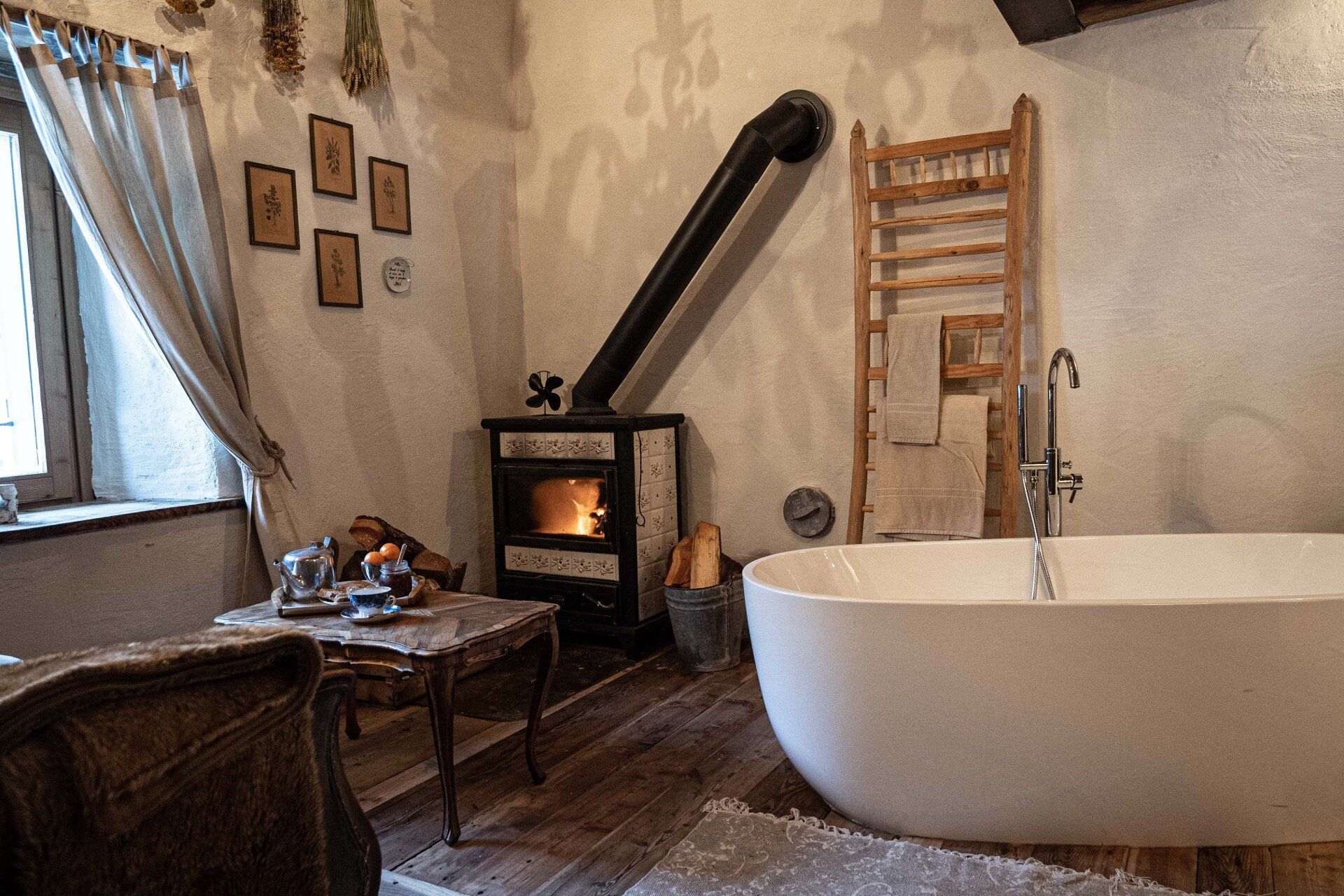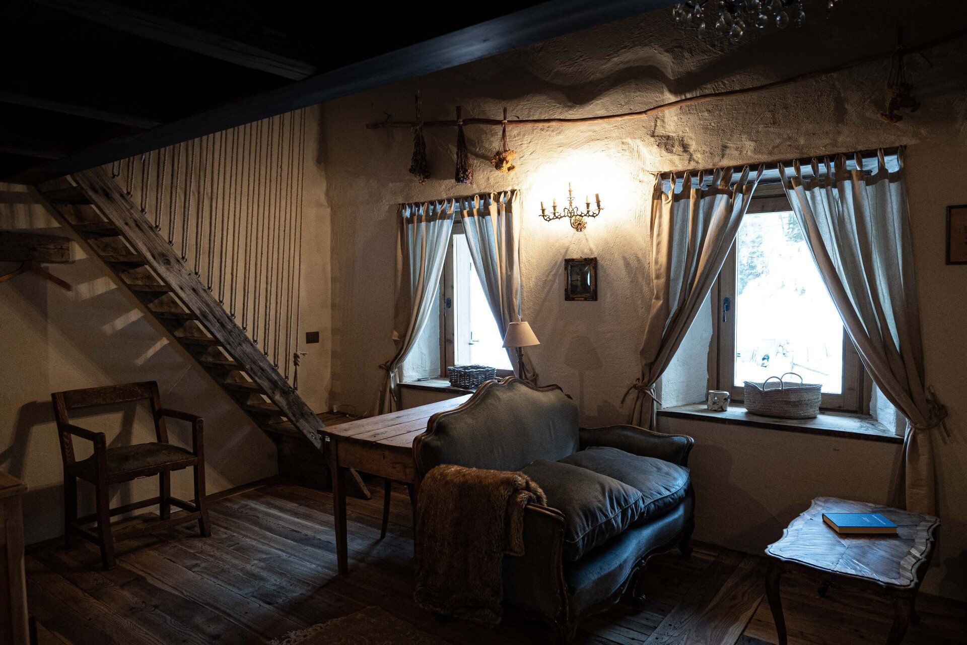A spacious comfortable suite overlooking the wide open snowfields outside, with a cosy sofa in front of an antique wood stove. Complete with an open bathroom on the first floor, a double bathtub where you can relax after your day outdoors, and a large shower room. The bedroom is on the mezzanine, with a double bed, plus an extra single bed to one side.