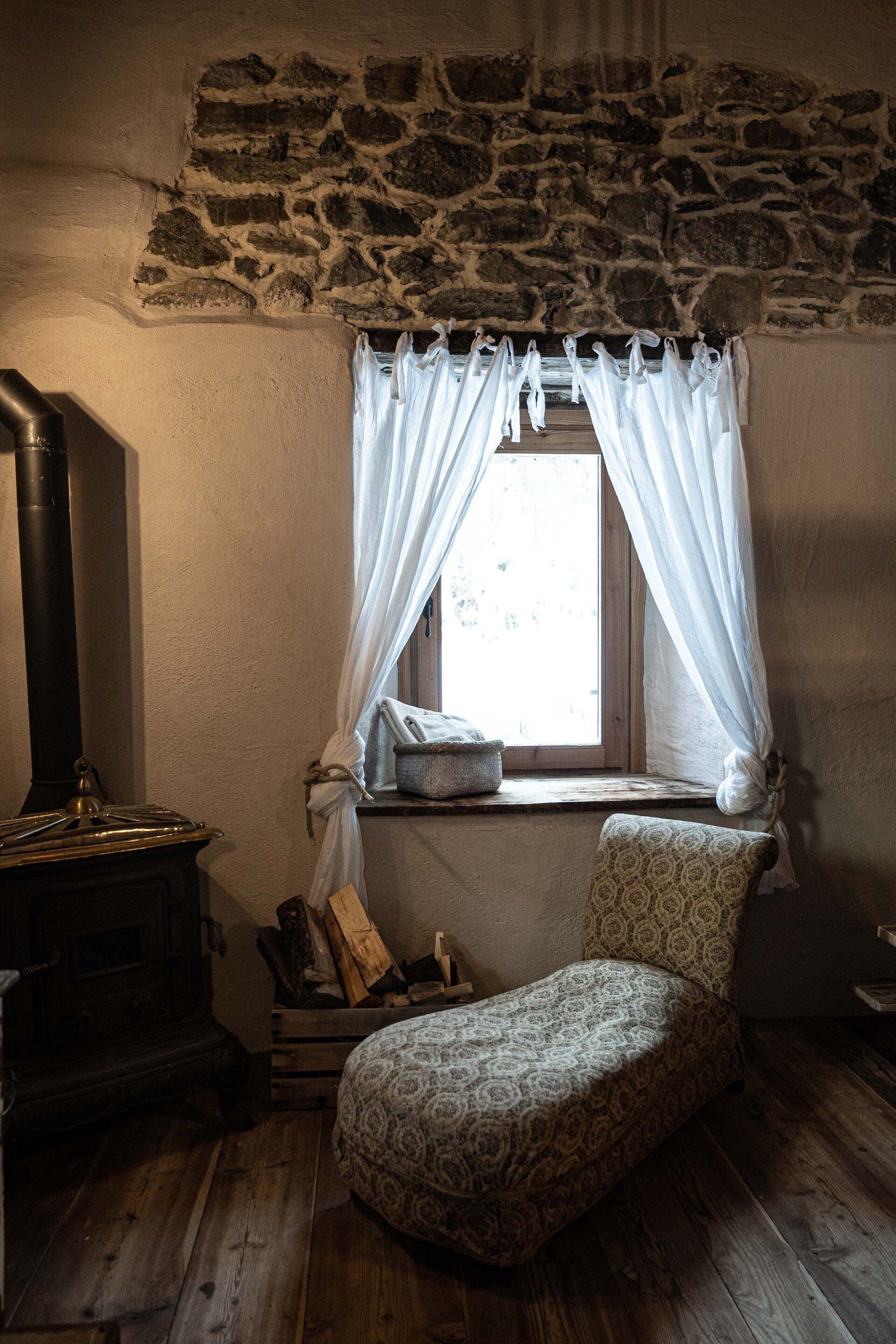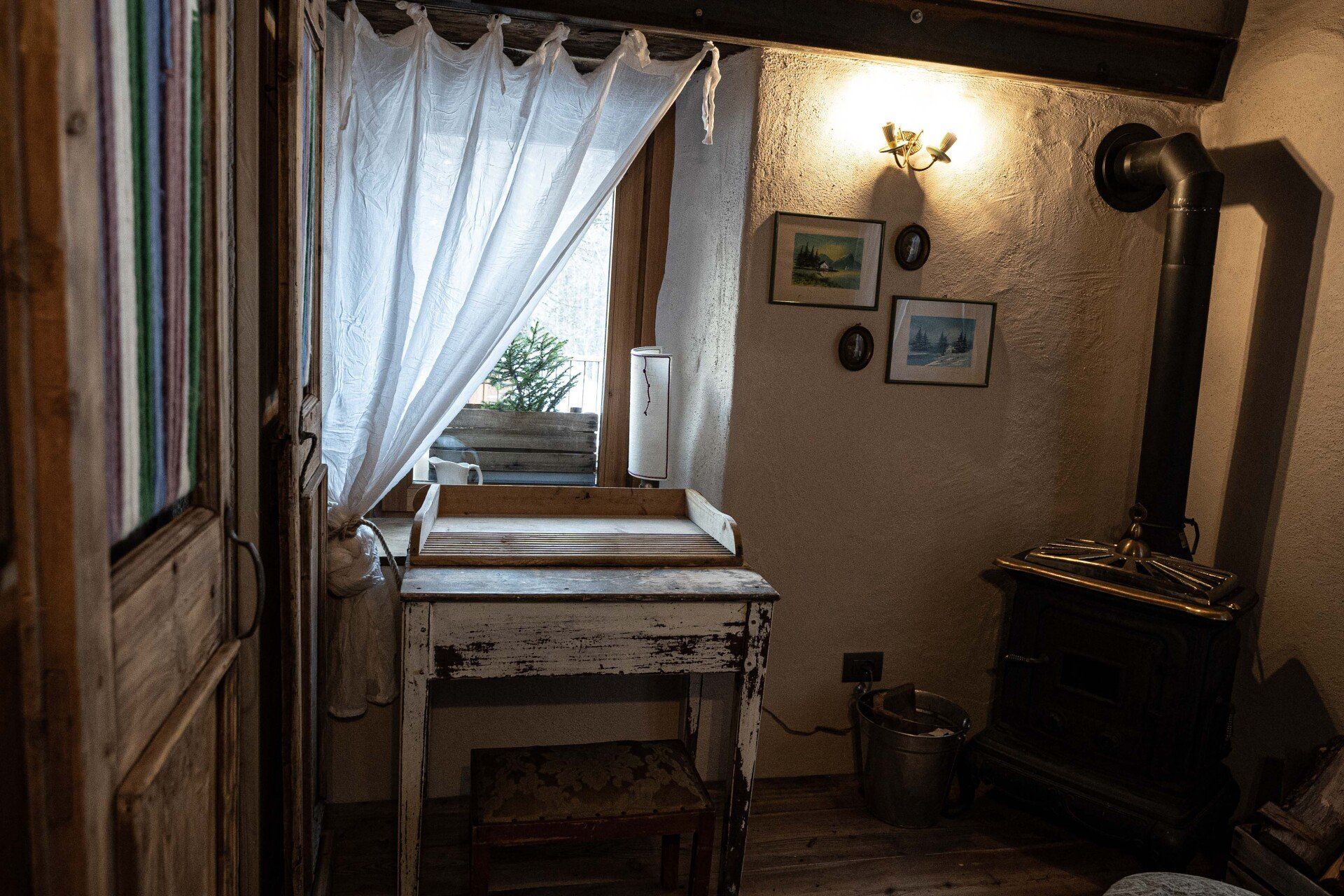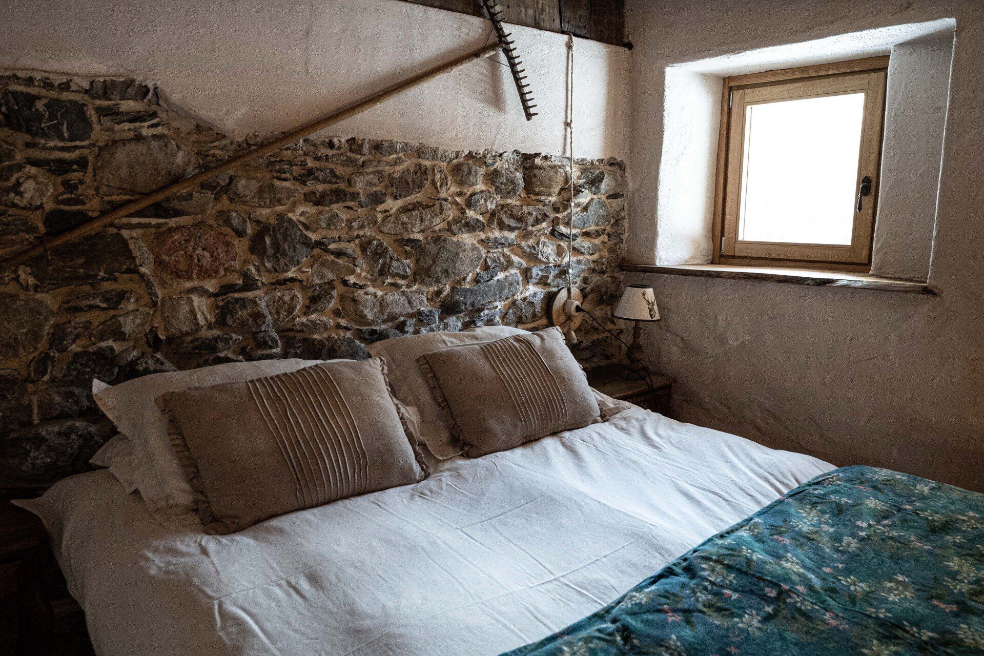 This is the smaller room, a snug comfy nest from where the little "finestrella" close to the double bed on the mezzanine, invites you to spy on the world outside, this room has a small private bathroom with a shower, plus a relaxing lounge corner with an antique wood stove.