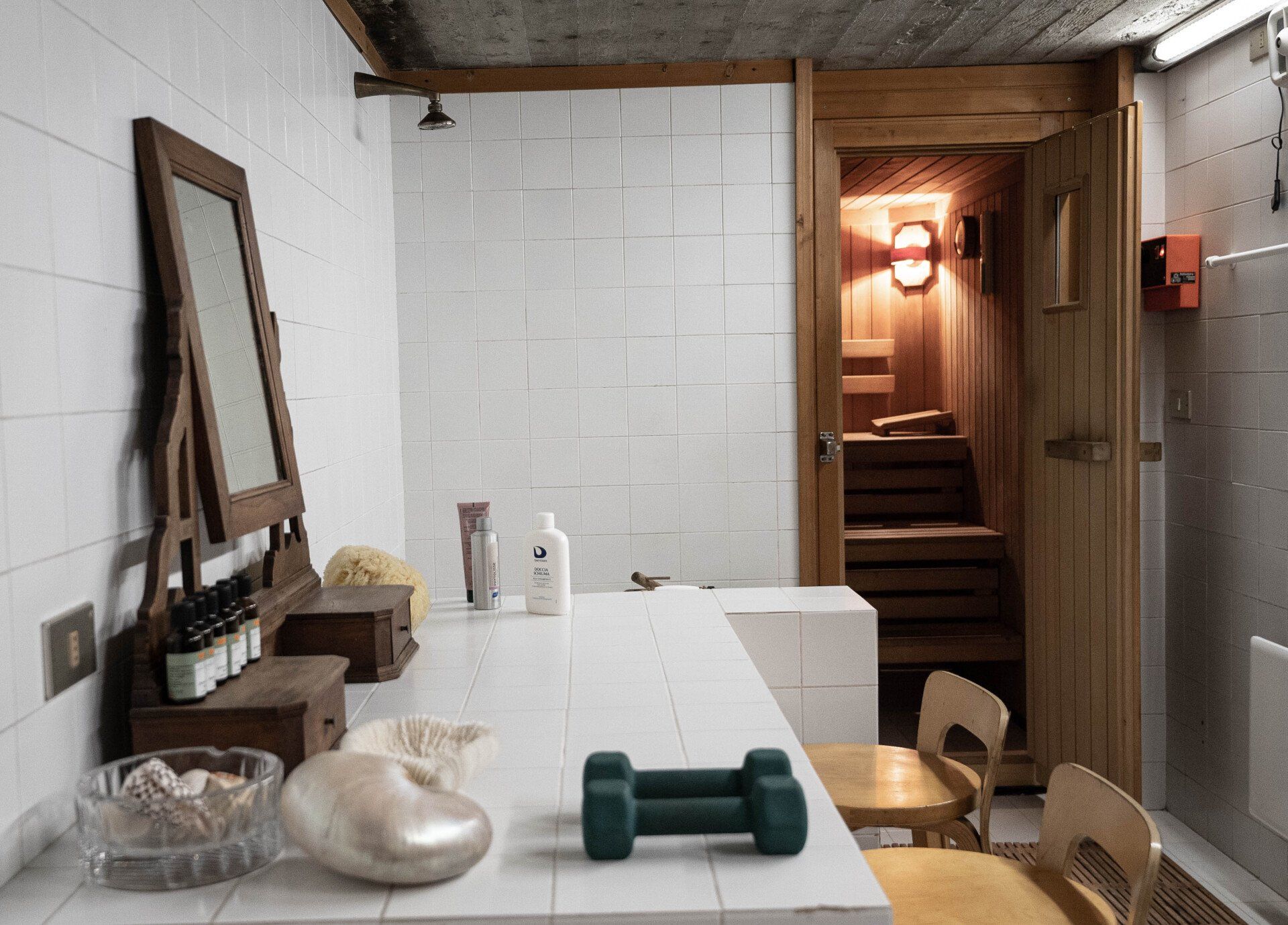 Two bathrooms, one fully furnished at the basement floor, with a relaxing room characterized by a large 6 person sauna and a shower, on the first floor a small bathroom with only WC and sink, followed by the beautiful big bathtub in the master room.