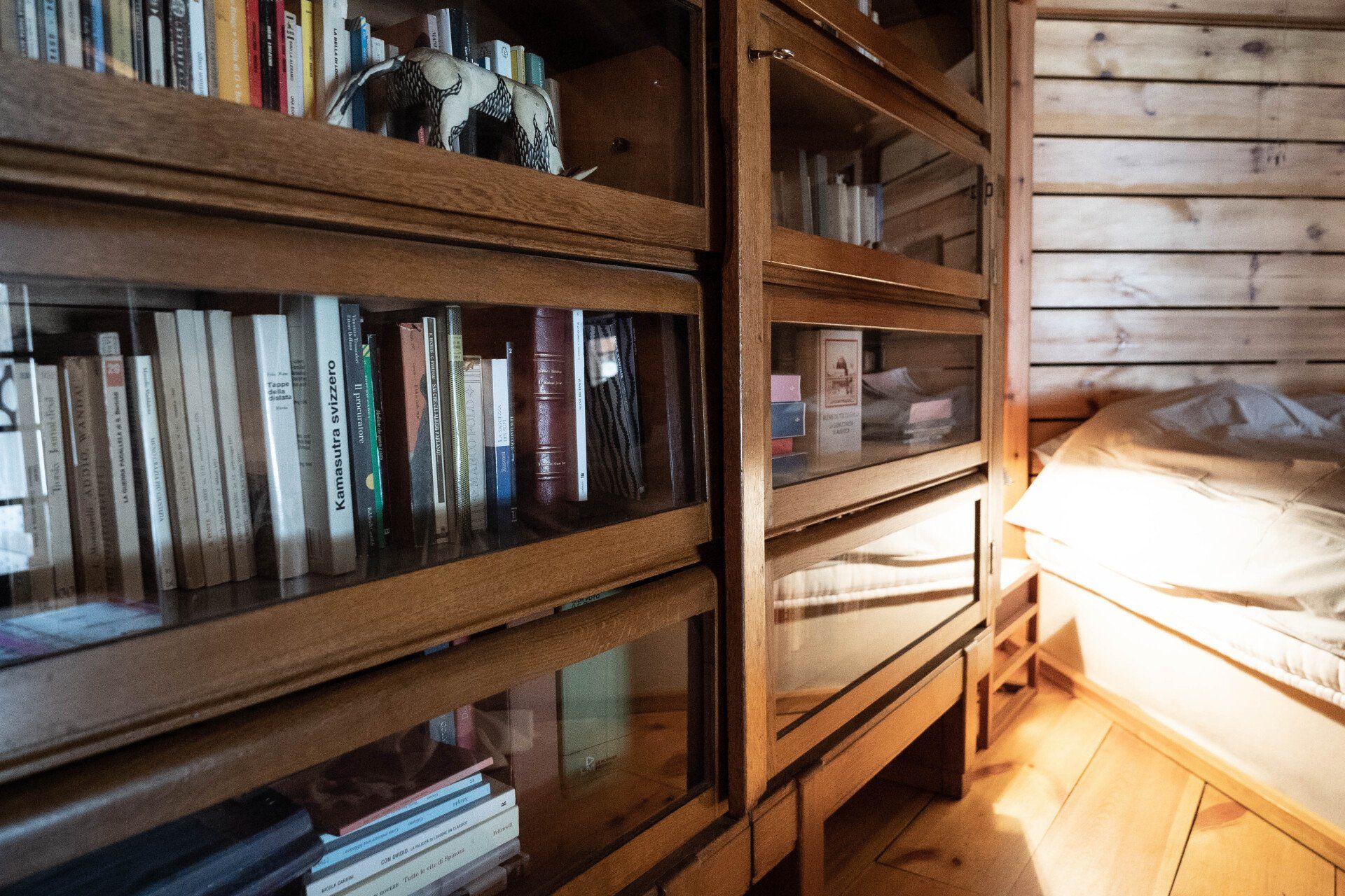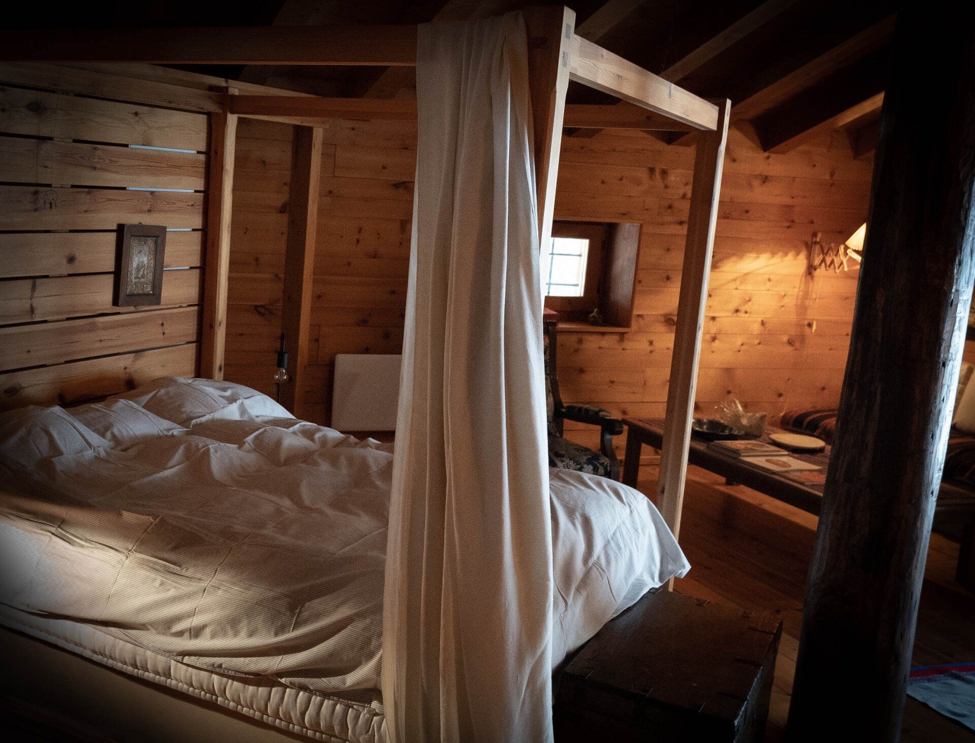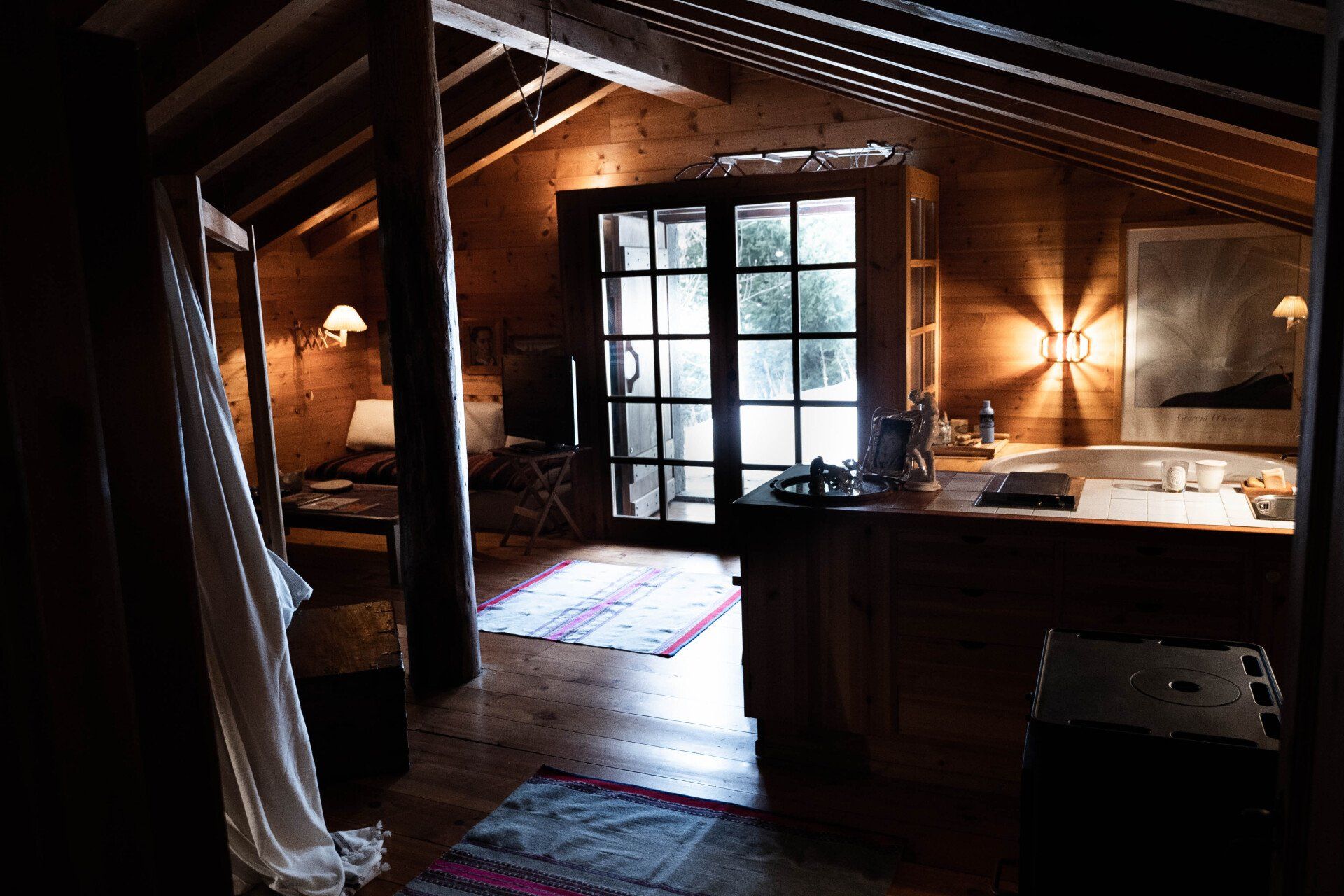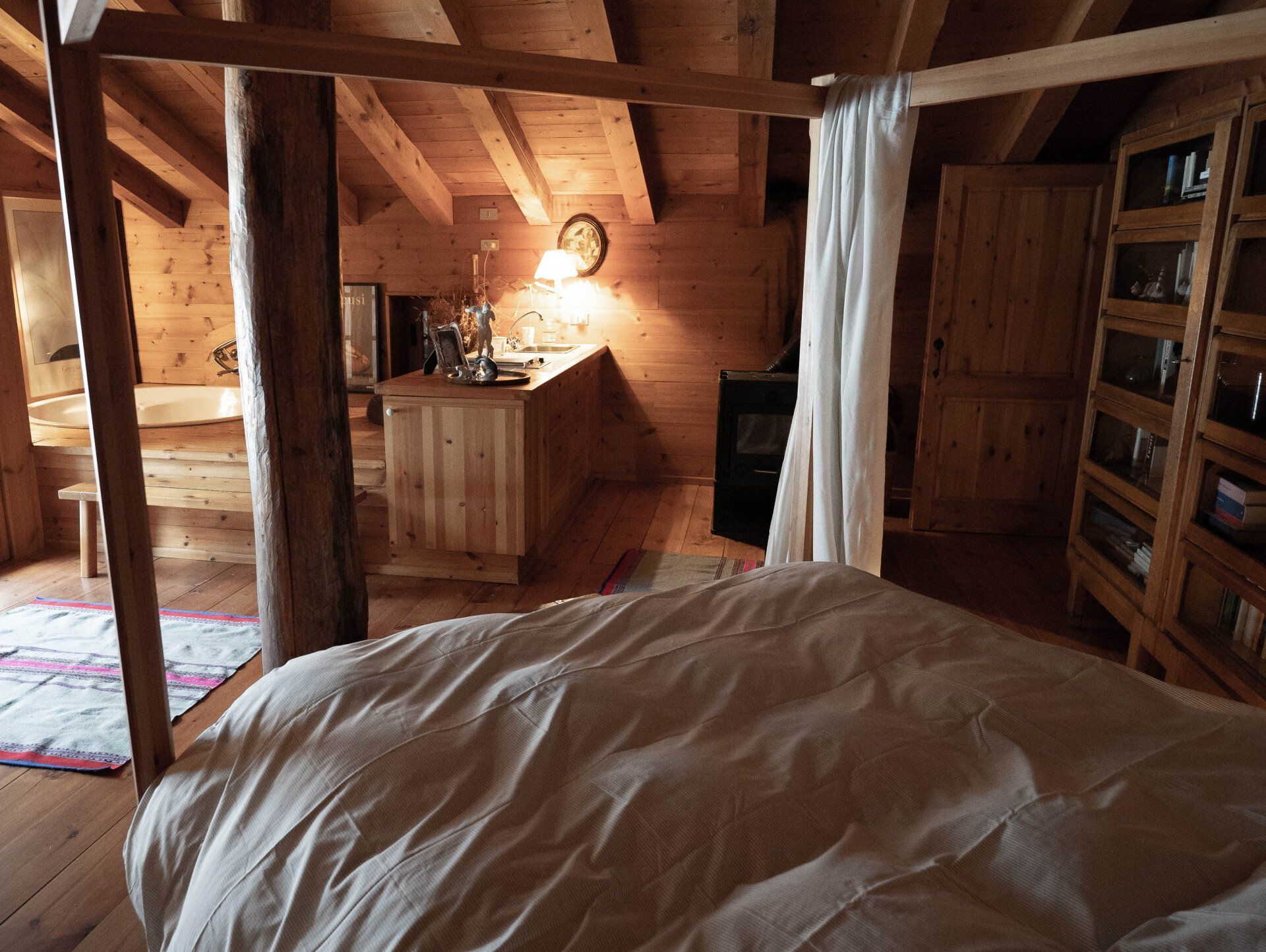 On the first floor is the main bedroom, a large spacious room with a wood stove, big bath tub, old beautiful library and a stunning view through the glass door that opens directly onto the garden.