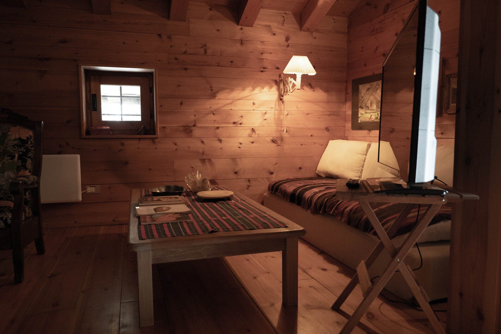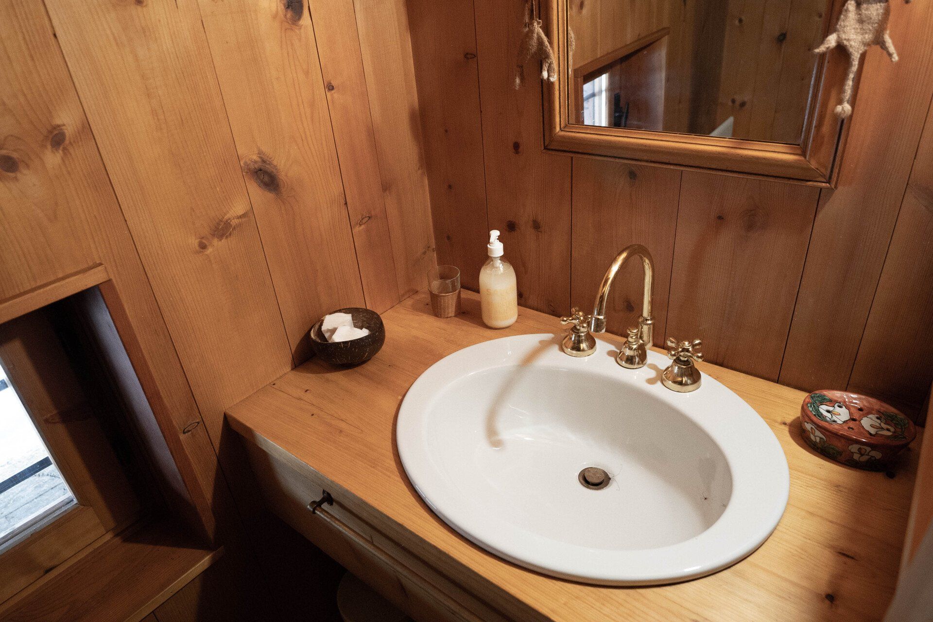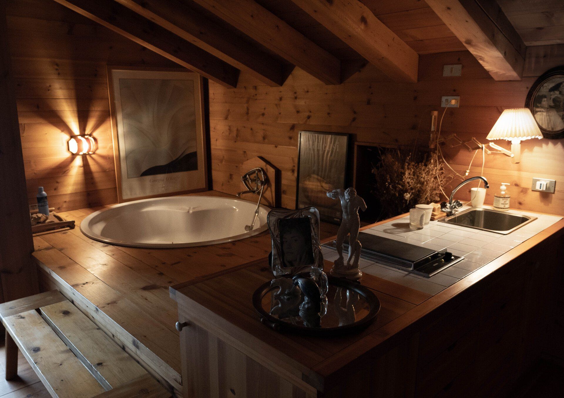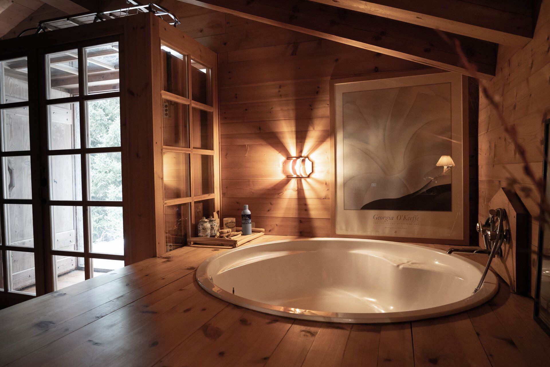 On the first floor is the main bedroom, a large spacious room with a wood stove, big bath tub, old beautiful library and a stunning view through the glass door that opens directly onto the garden.